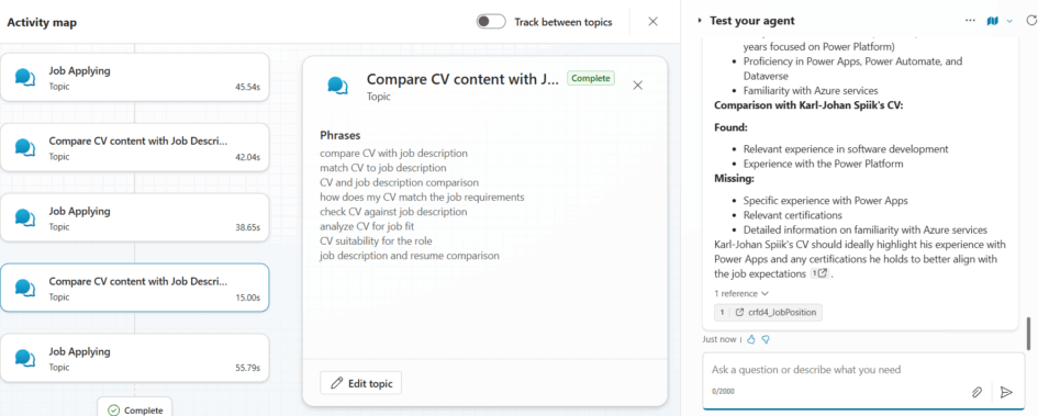 Off course there needs to be a lot adjustments to do, but this is success to get the CV content and the AI to compare it with the knowledge source content. I think I should use more variables and prompts instead of traditional topic actions and questions. This section will take a lot of testing and prompting with various data to get it production ready. But for creating a demo, I think I will do it only so that my demo case looks good when I present this.