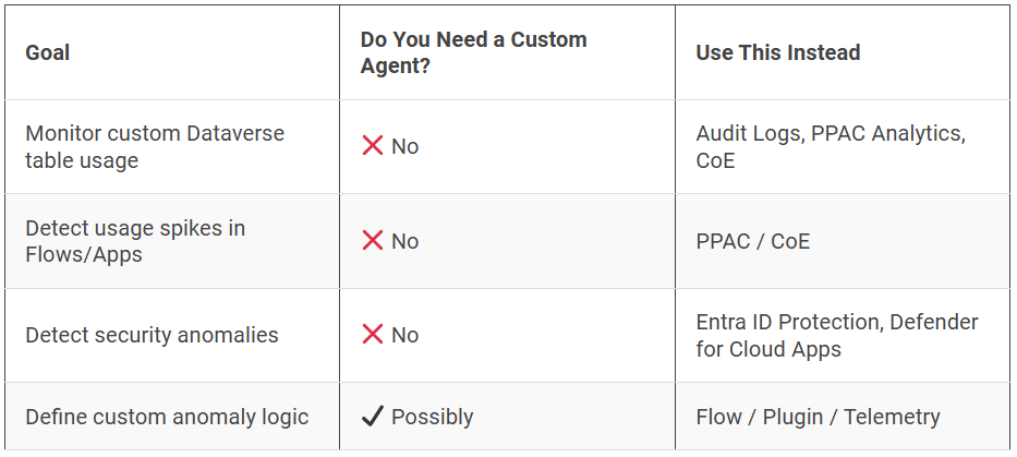 | Monitor custom Dataverse table usage | ❌ No | Audit Logs, PPAC Analytics, CoE |