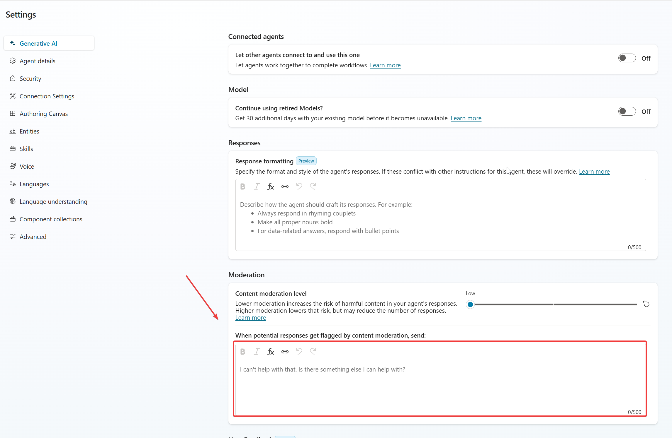 Let’s go to the actual thing. We want to prevent prompt-injection and let’s concentrate on that. I decided not to lecture the user. You should put the system prompt for the Create Generative Answers node properties Custom moderation level setting. I used the recognizing prompt to the agent and tested.