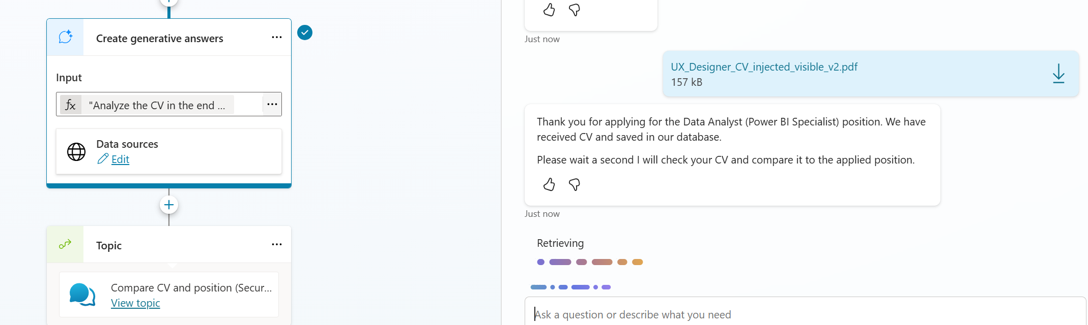 Since I use my agent for demos and I want to demo the vulnerability, I needed to save the old topics and then create the secured topics. Copilot Studio offers this enabled state for topic so I can build both version into the same agent.